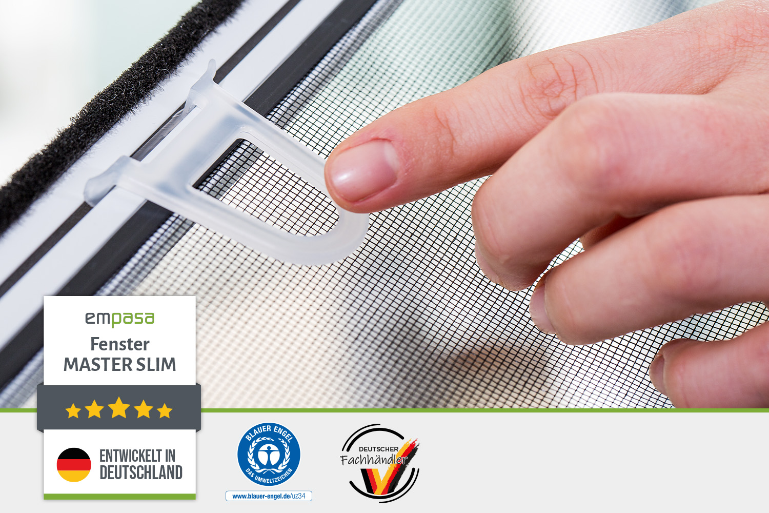 Das Fliegengitterfenster „MASTER SLIM“ bietet dir zuverlässigen Insektenschutz und lässt sich flexibel an deine Bedürfnisse anpassen. Du hast die Wahl zwischen Filatec®-Gewebe für eine besonders klare Sicht nach draußen oder einem Pollenschutzgewebe für allergikerfreundliches Wohnen. Dank der schlanken Bauweise mit nur 11 mm Einbautiefe eignet sich der Rahmen auch für enge Einbausituationen, etwa zwischen Fenster und Rollladen. Die Montage erfolgt schnell und ohne Bohren mithilfe von Klemmfedern – eine flexible und durchdachte Lösung für dein Zuhause. Für große Fenster ist eine passende XL-Variante in 130 x 220 cm erhältlich.
