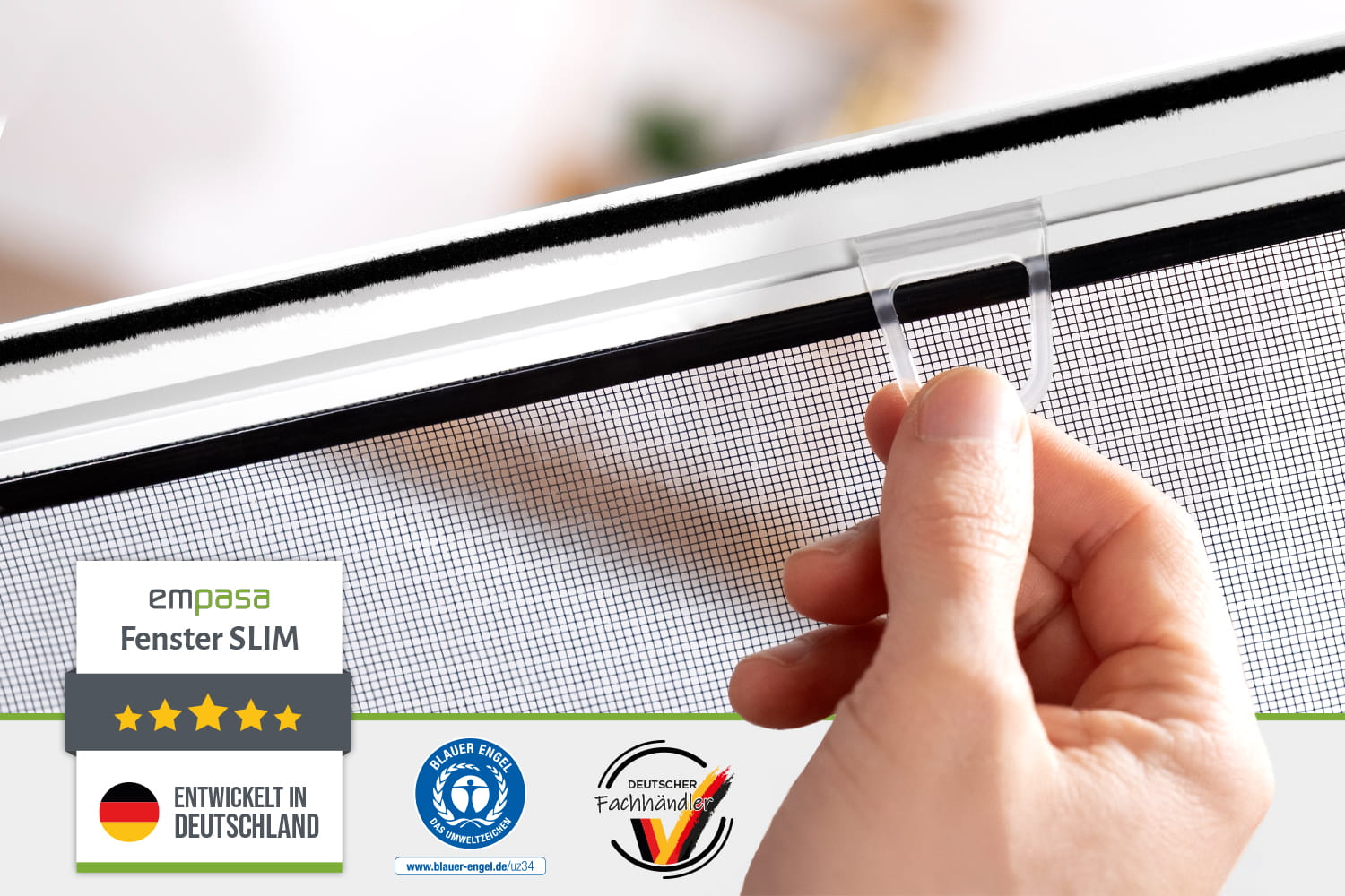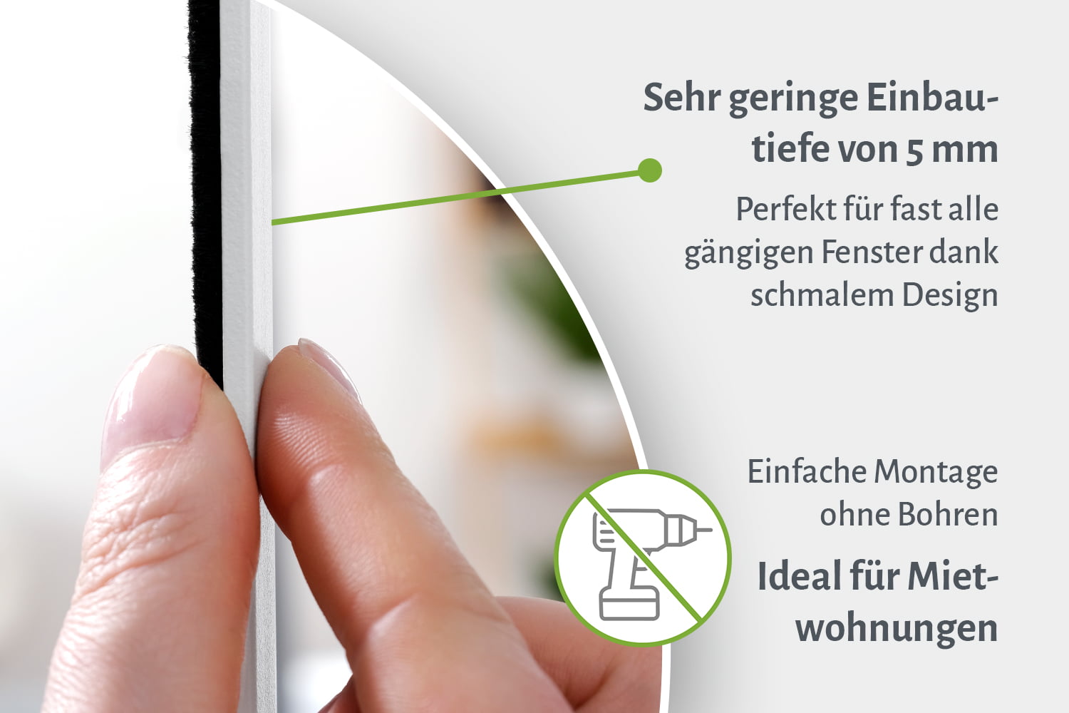 Der besonders schlanke Insektenschutz-Spannrahmen „SLIM“ verbindet zuverlässigen Schutz mit elegantem Design. Mit nur 5 mm Einbautiefe ist er unsere schmalste Lösung – ideal für Fenster mit wenig Platz, zum Beispiel zwischen Fenster und Rollo. Schmaler geht nicht – der Rahmen fügt sich dezent in jede Fensteroptik ein. Die Montage ist besonders einfach und schnell erledigt: Dank praktischer Steckverbindungen und Spannfedern lässt sich das Fliegengitter ganz ohne Bohren sicher einsetzen. Ideal gerade bei Mietwohnungen! Auch bei größeren Fenstergrößen überzeugt „SLIM“ durch hohe Stabilität. Robuste Aluminiumprofile in Kombination mit metallverstärkten Eckverbindern sorgen für einen festen Sitz und dauerhafte Formstabilität. Für den optimalen Schutz stehen zwei Gewebearten zur Auswahl: Das schwarze Filatec®Insektenschutz-Gewebe für klare Sicht und gute Luftzirkulation oder ein Pollenschutz-Gewebe, das zusätzlich die Pollenbelastung reduziert.
