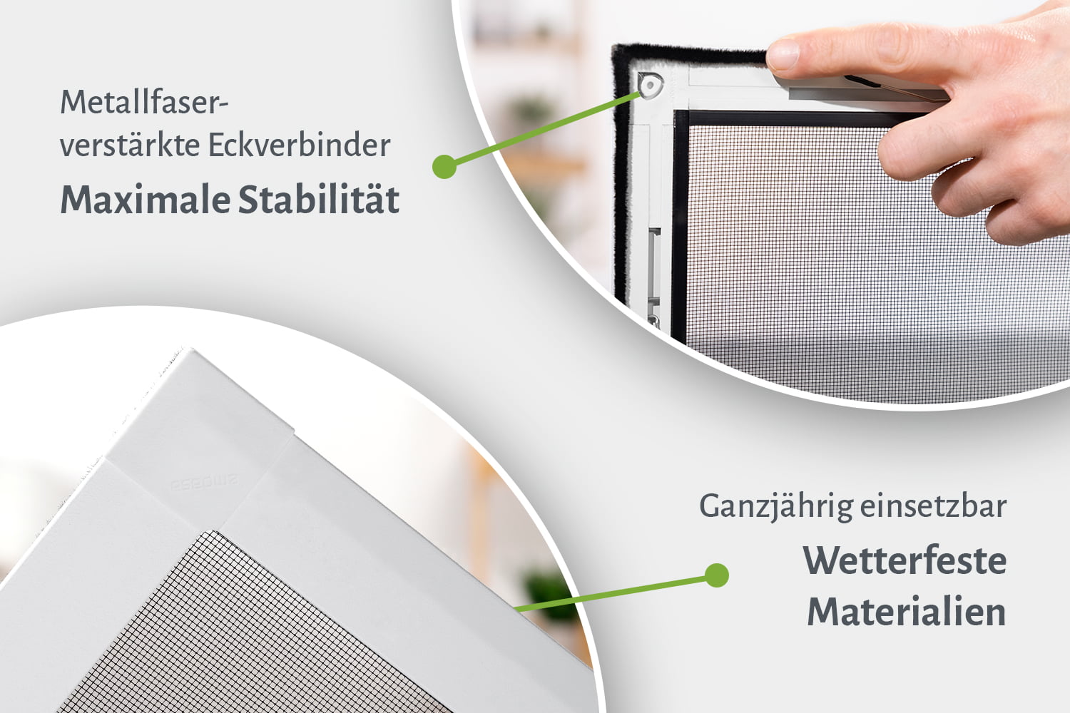 - Stabil auch bei großen Fenstergrößen durch metallverstärkte Eckverbinder