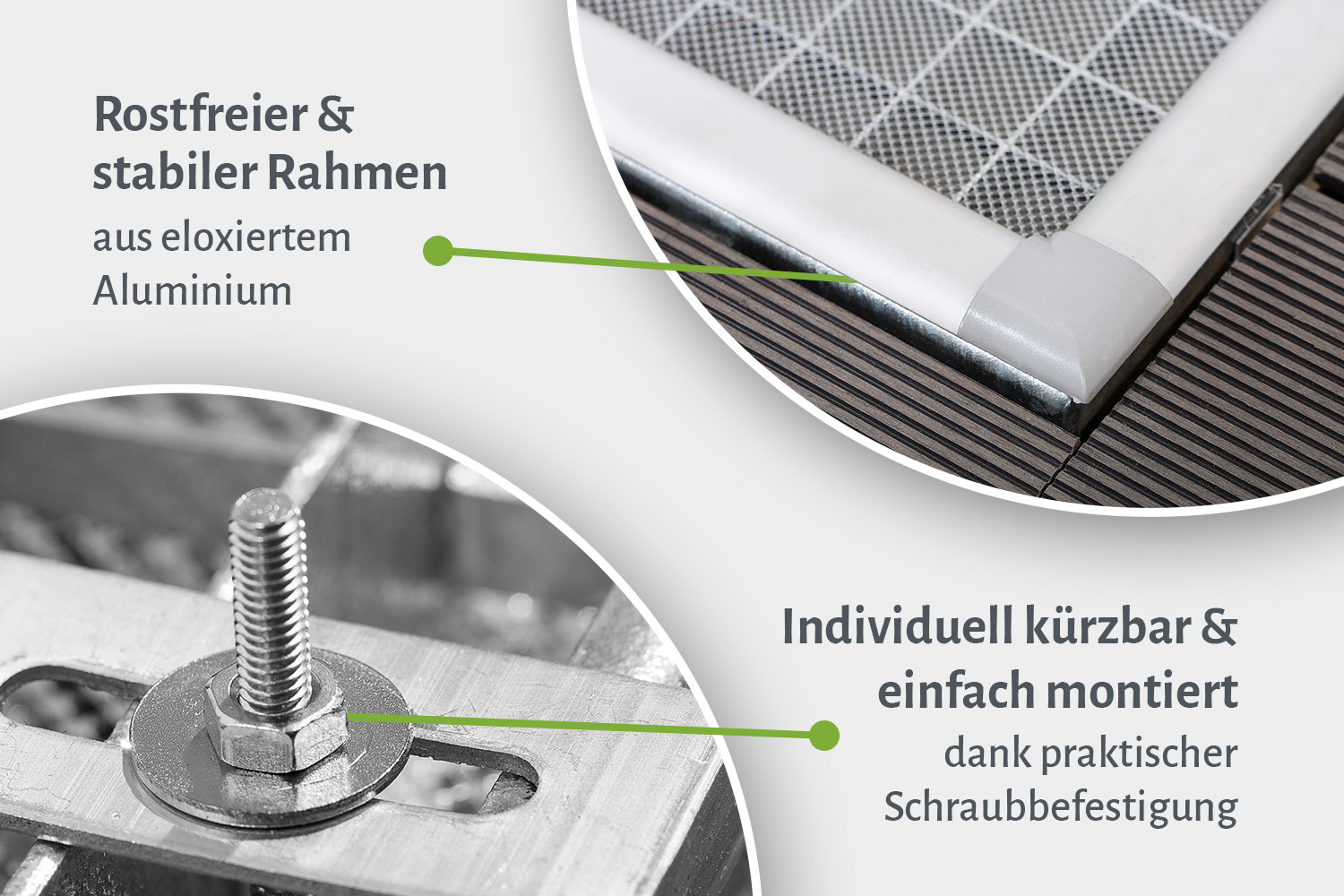 Die eloxierten Profile sind stabil und bei Bedarf individuell kürzbar. Präzise Eckverbinder sorgen für einen nahezu nahtlosen Übergang; Abdeckkappen runden den Abschluss optisch sauber ab.