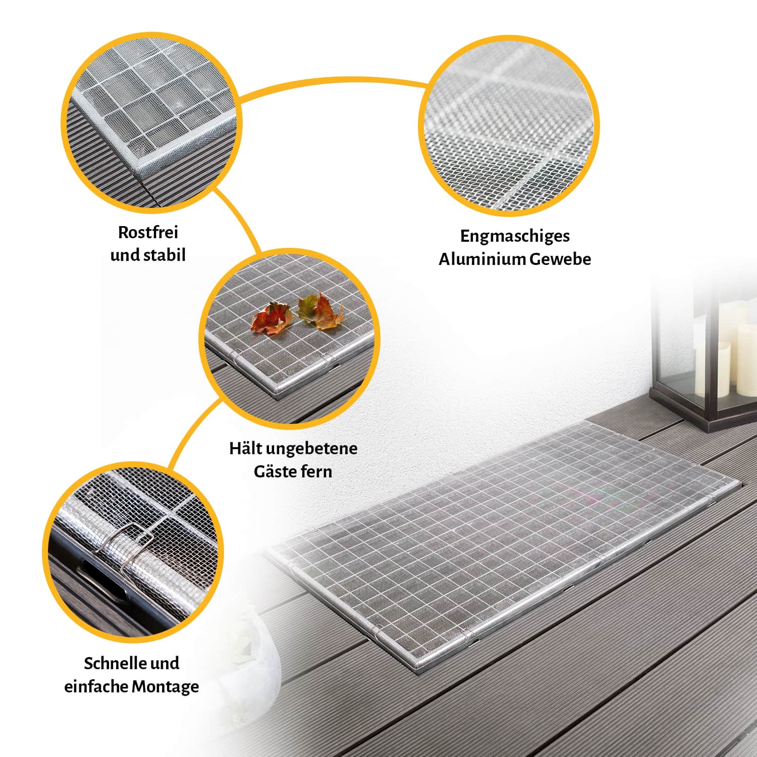 Dieses praktische Schutzgitter erspart dir viel Arbeit, denn es macht das Reinigen des Kellerschachts nicht mehr notwendig. Sowohl Blüten im Frühjahr, als auch Laub im Herbst bleiben draußen, genauso wie ungebetene Spinnen, Mäuse und Ähnliches. Durch das engmaschige Gewebe, wählbar in Aluminium oder Edelstahl, dringen lediglich Licht und Luft. Die langlebige Lichtschachtabdeckung ist schnell und einfach mithilfe von Befestigungsfedern am Kellerschacht angebracht. Kein Rosten, kein Pflegeaufwand. Der Insektenschutz ist für alle gängigen Schachtgrößen geeignet.